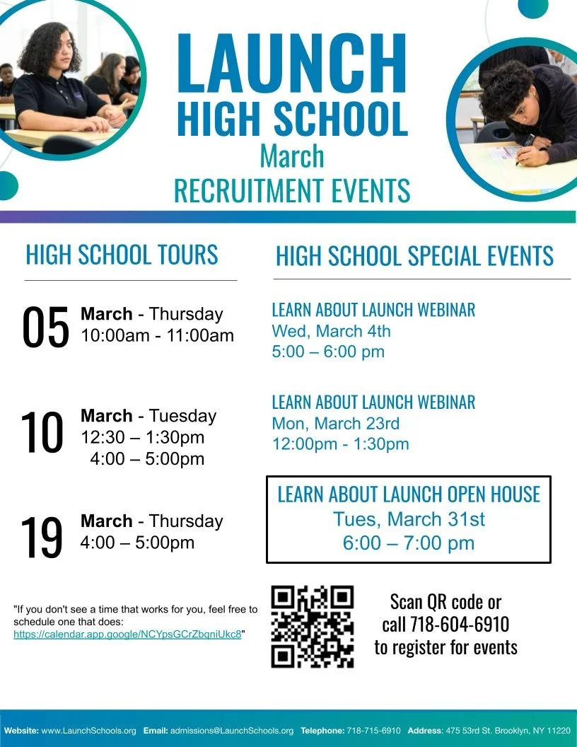 Nuestras escuelas públicas charter gratuitas en Brooklyn atienden a estudiantes de 6.º a 8.º grado en Launch Middle School, y de 9.º y 10.º grado en Launch High School. Launch High School crecerá cada año hasta atender finalmente a los grados 9 a 12.